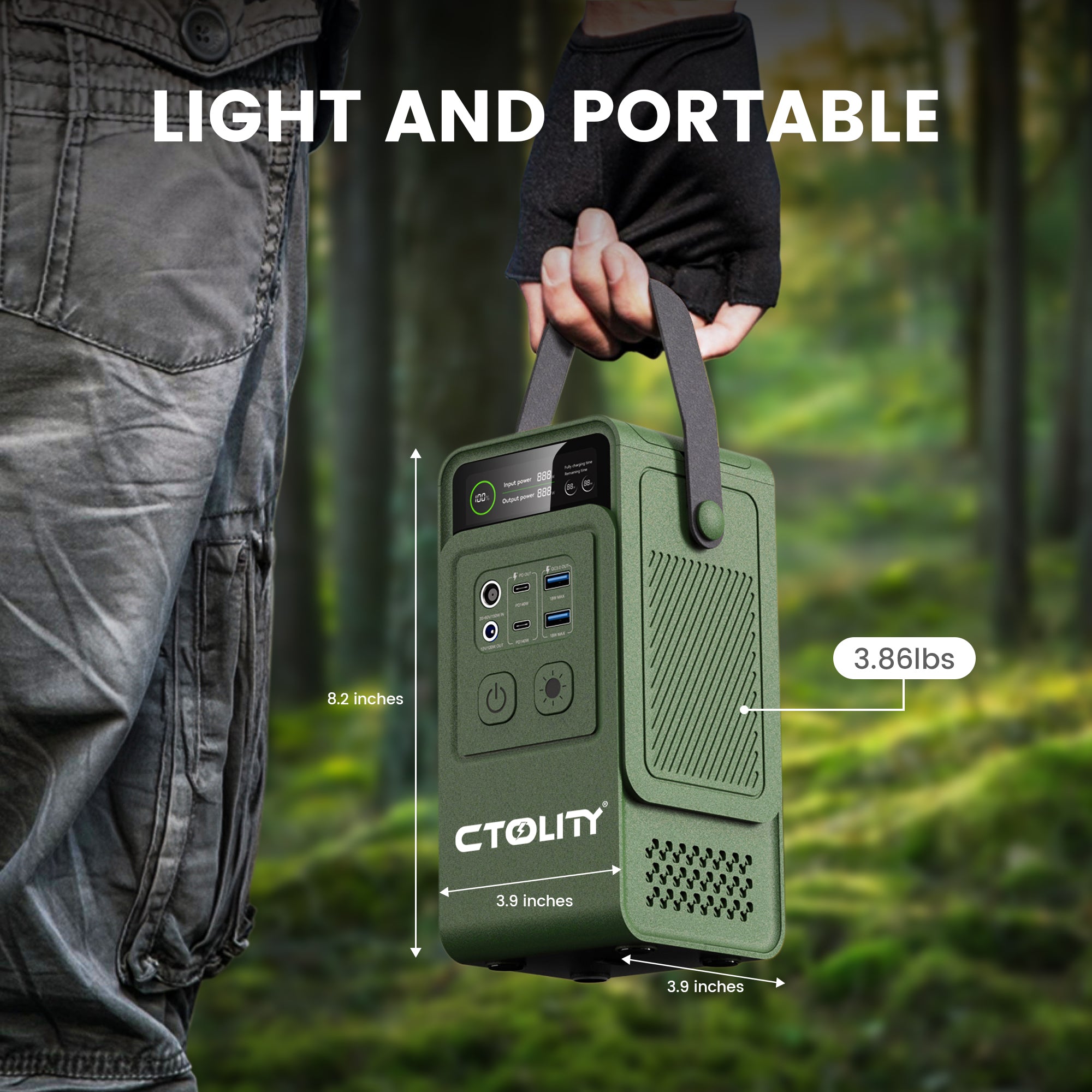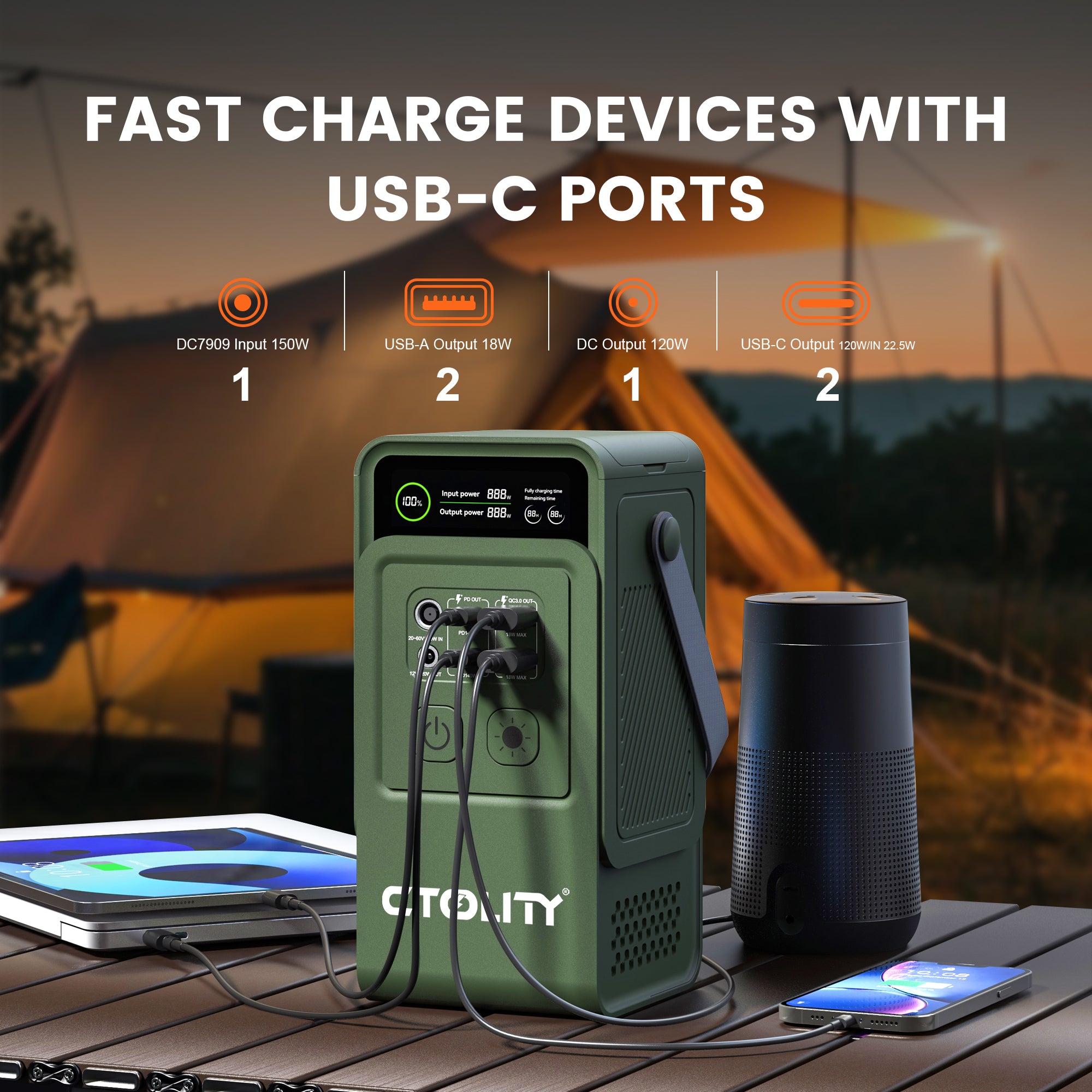 The Ctolity AP200L features USB-C 140W, USB-A, and DC ports to charge multiple devices. Lightweight and easy to carry. Supports solar, car, and wall charging.